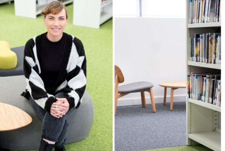 המעצבת לילך רז על רקע הספרייה העירונית בחריש שעוצבה על ידה