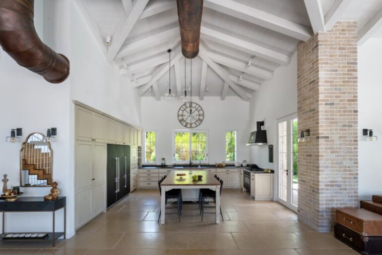 השילוב בין קירות לבנים ועמודים מחופים בבריקים עתיקים מתחבר עם סגנון העיצוב בתוך הבית