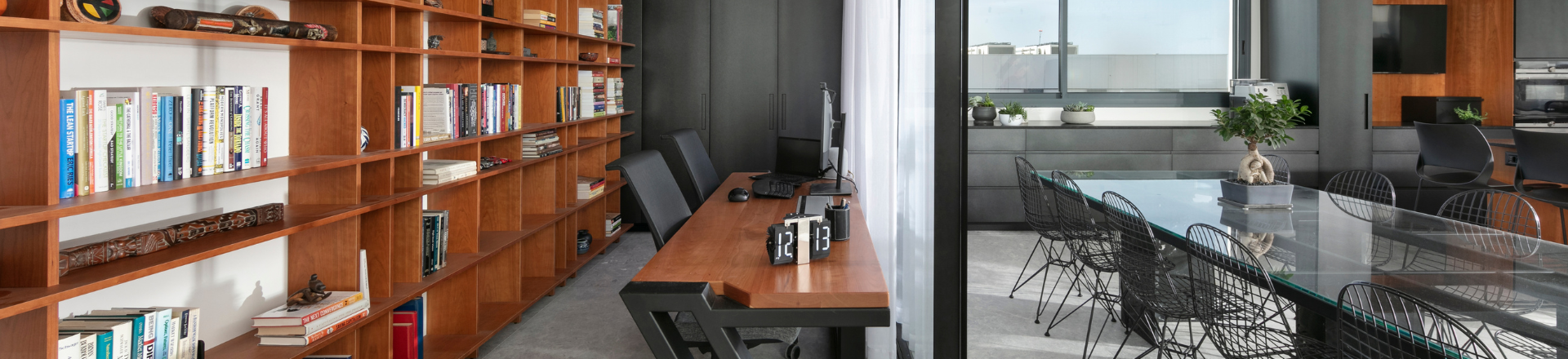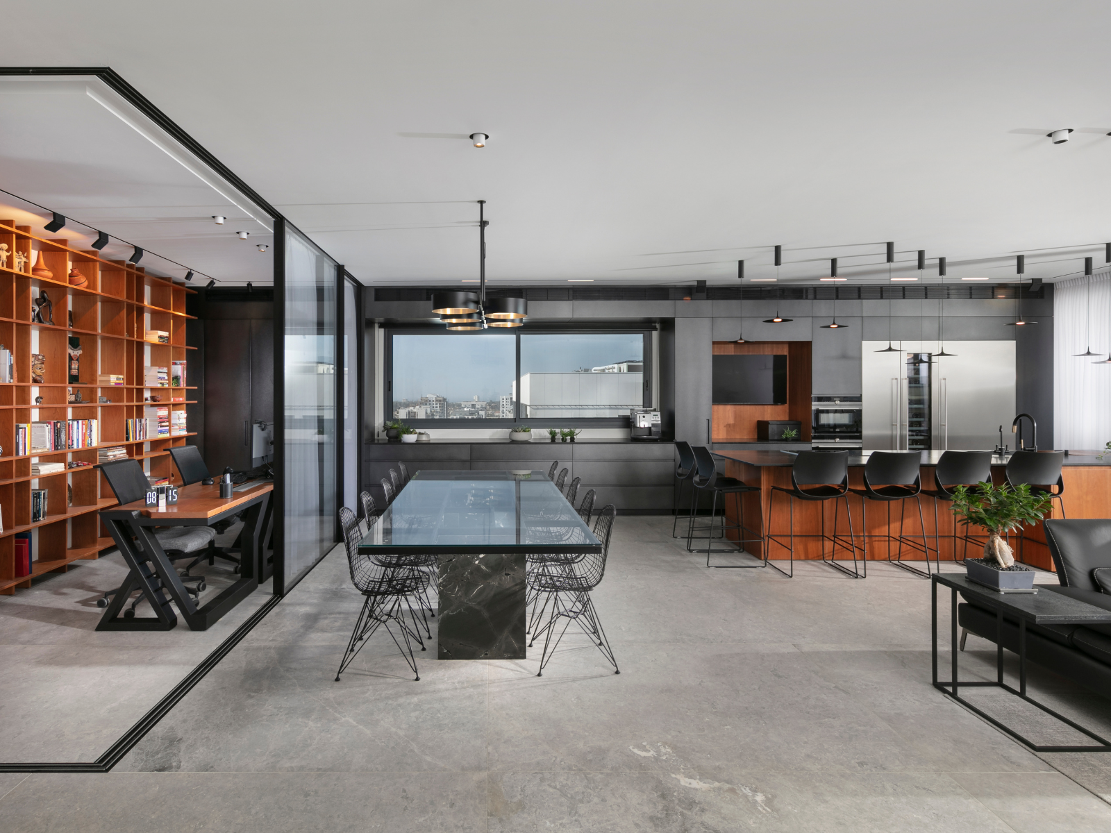 "בני הזוג עובדים מסביב לשעון לכן חשוב היה לנו ליצור עבורם חדר עבודה נעים ומרווח בלב החלל הציבורי, שישתלב בהרמוניה באסתטיקה הנקייה. יצרנו ספריה מרשימה בה שולבו ספרים ופרטי אומנות אותם ליקטו בעלי הדירה לאורך השנים. הספרייה, פרי עבודתו של דוד גרוס נגר אומן, יוצרה מפלטות עץ דובדבן SELECTED שנבחרו בקפידה. בכדי להעמיק את הקשר בין חדר העבודה לחלל הציבורי השתמשנו באותן פלטות גם לחזית האי במטבח וכן עבור חיפוי של נישות שונות. בין שתי הפונקציות ניתן לחבר ולהפריד בלחיצת כפתור על פי צורך זאת הודות למחיצת זכוכית ואלומיניום מתקדמת ווילונות חשמליים אותם ניתן להגיף בעת הצורך".