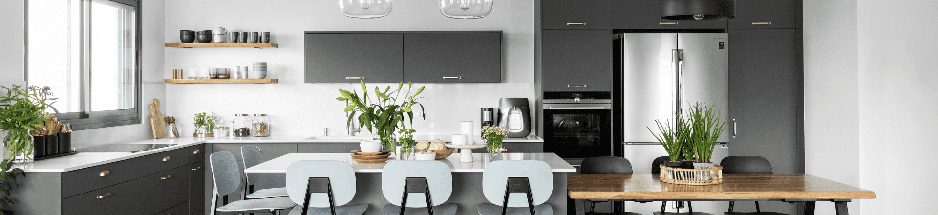 בהחלטה משותפת עם בני הזוג, הסגנון משלב בהצלחה בין המודרני לכפרי וכל הבחירות נעשו בהתאם: "החלל הציבורי רוצף ריצוף אפור במראה בטון בעוד חדרי השינה חופו בפרקט, שמעניק תחושת חמימות מחבקת", אומרת אברמסון. "המטבח עוצב בגוון אפור כהה מודרני ועל מנת להוסיף לו אותו טאץ' כפרי, שילבתי בו שולחן עץ גושני וידיות מוזהבות. פלטת הצבעים בדירה מבוססת על צבעוניות קרה ומונוכרומטית על טהרת אפור, לבן, תכלת ושחור, עם נגיעות קלות של עץ וזהב, וכמובן ירוק של צמחיה".