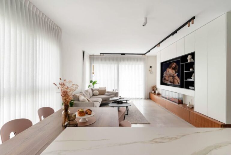 עם פתיחת דלת הכניסה מתגלה הקו העיצובי שמודגש בכל הדירה. גוונים בהירים בקווים נקיים ואלגנטיים, לצד פרקטיות שמותאמת במדויק לדיירים. רמת ההתייחסות הגבוהה להרגלי החיים של הדיירים ניכרת במטבח, שעוצב למשפחה בה לא מרבים לבשל, אבל מנגד אוהבים להסב ביחד לארוחות משפחתיות. לכן, משטחי העבודה עוצבו בממדים סבירים, ושולחן האוכל עוצב בגובה נוח להורים ולשלות הבנות. האור שבוקע מדלתות זכוכית הוויטרינות, מוסיף לקו האלגנטי בו מעוצב המטבח. צבע הפודרה שנבחר לכיסאות פינת האוכל, יוצר טוויסט מרענן היוצר תחושה של שלווה.
