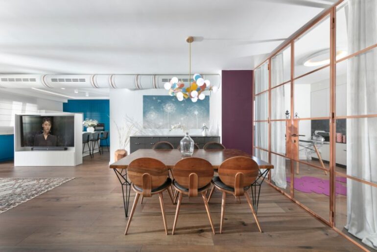 לאחר כ-25 שנות מגורים בבית פרטי עם גינה גדולה בסביבה פסטורלית, החליטה המשפחה, זוג עם שני בנים בוגרים, לשנות אווירה ולעבור לגור במגדל מגורים אורבני. עבור האישה, מתכננת ומעצבת פנים, והגבר, מהנדס, השינוי היה כפול – מבית לדירה, מיישוב קהילתי לעיר. "את הדירה הזו רכשנו באופן הכי ספונטני", מספרת מעצבת הפנים הדס פילובסקי-רון שאמונה על התכנון והעיצוב של הדירה. "נותרו לנו כ-3 חודשים עד לפינוי ביתנו וטרם מצאנו מקום מגורים חלופי. ברגע שנכנסנו לדירה, החלטנו לרכוש אותה בלי לחשוב פעמיים".