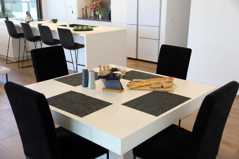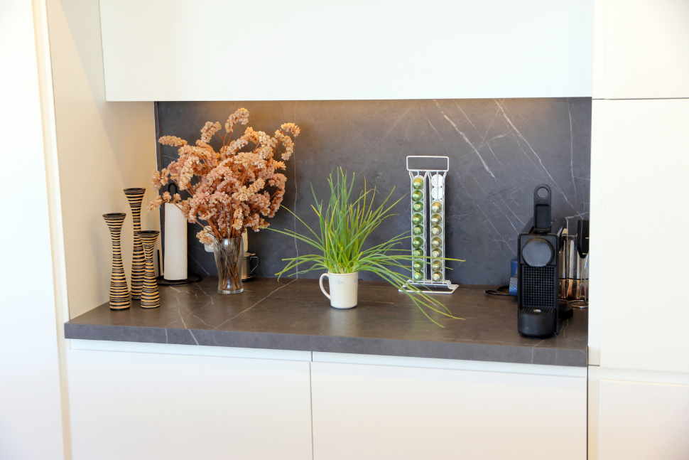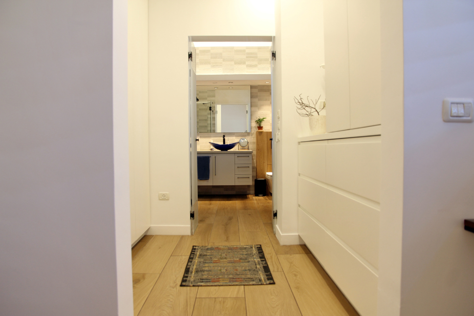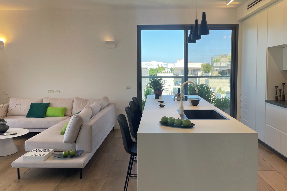 הדירה, נרכשה "על הנייר". מכול הבחינות זה היה יתרון גדול. השינויים המבנים שהותאמו במדויק לצרכים וטעמם של בני הזוג, בוצעו במהלך הבנייה ללא שינויים והריסות. הידיד ורעייתו חזרו לקנדה. לבקשתם, מיכל, שעבודתה מולם נעשתה באון ליין, קיבלה על עצמה את האחריות ושליטה מוחלטת על תכנון ועיצוב הדירה, כולל בחירת חומרי הגמר בפרויקט שהיה קרוב ללבה, היא חשה כעושה לביתה ומשפחתה.