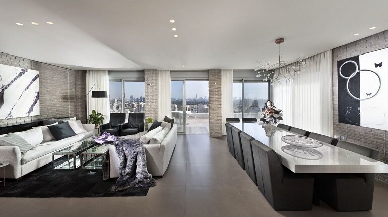 פנטהאוז רחב ידיים תוכנן מחדש והותאם לצרכי הדיירים, בני זוג ולהם ילדים בוגרים אשר כולם, פרט לאחד, מתגוררים מחוץ לבית. הדירה, המתפרשת על שטח של 150 מ"ר, בתוספת מרפסת המקיפה את חלקו הדרומי (70 מ"ר נוספים) ממוקמת בבניין חדש בקומה גבוהה, באחת השכונות היוקרתיות של העיר תל אביב.