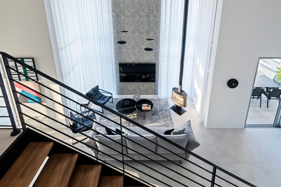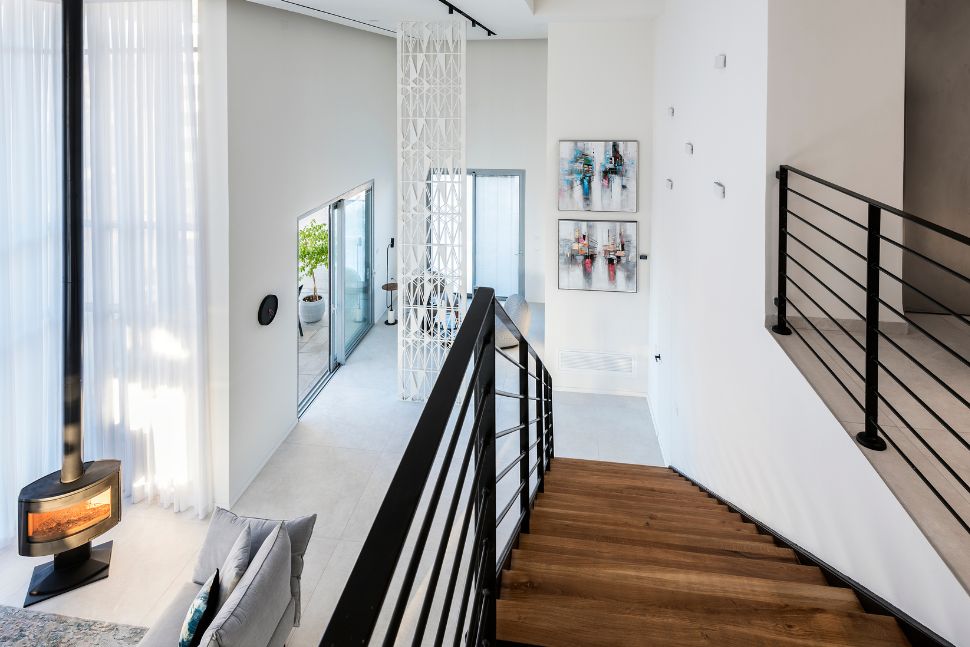 אלמנטים עיצוביים מדגישים את הגובה המרשים של דירת פנטהאוז דו מפלסית, המשקיפה על נוף מדהים