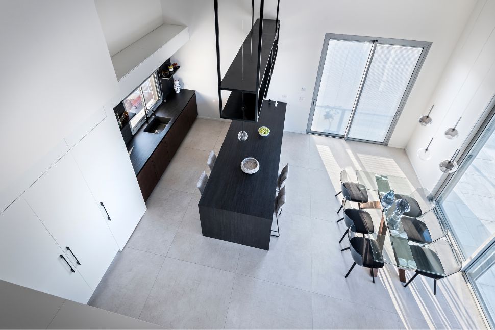 על אף שגם במטבח התקרה מגיעה לגובה כפול, קו העיצוב של המטבח מסתיים בקו מעקה המדרגות לקומה השנייה. העיצוב הנקי והפונקציונלי שבמטבח של חברת "רגבה", שיחד עם המעצב, יצרה את מטבח בהתאמה אישית מושלמת, מודגש באמצעות שילוב בין לבן לשחור. משטח העבודה שסביב הכיור, חיפוי הקיר מעליו והמשטח העליון באי השחור שגולש עד הרצפה, עוצבו מלוחות שיש של חברת "אפולודור שיש ברמה אחרת", שיצרה עבור המטבח וחדרי הרחצה, שיש מדוקק ומרחף בהתקנה מיוחדת . מעל האי, עוצבה כוננית התלויה מהתקרה. במקביל לאי, פינת אוכל עם משטח עליון שקוף, המתכתב עם חזית הארון שעוצב בדופנן של הארונות הגבוהים.