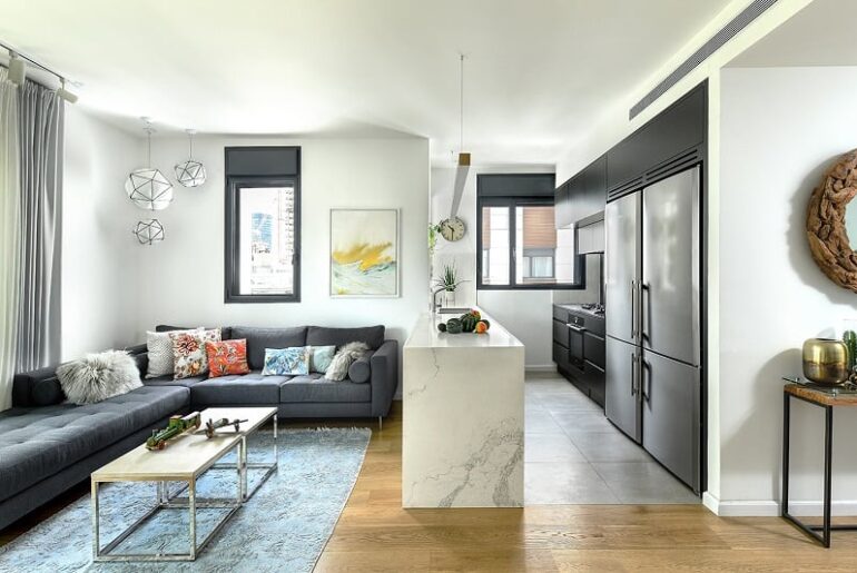 אב המשפחה, בעל משרד לפרסום ומיתוג, ושני ילדיו ביקשו לתכנן ולעצב עבורם דירת מגורים מעוצבת ומוקפדת, בה המטבח משמש לב ליבו של הבית. כמשפחה בה האירוח תופס חלק מרכזי בשגרת היום יום, היה ברור כבר בשלב התכנון כי חלוקת החלל תושפע בראש ובראשונה מעיצוב סביבת המטבח. לבקשתם של בני הבית תוכנן מטבח מרווח ורחב ידיים, אשר ממוקם במרכז חלל המגורים והמחבר בין אזור הבישול וחלל האירוח. לצורך כך, עוצב המטבח כשני טורים מקבילים, מצד אחד ניצבת חזית ארונות גבוהים בצבע אפור פחם, המאכלסת בתוכה מקרר בגודל כפול, כיריים ותנור אפיה. מצידו השני של המטבח ניצב אי עבודה לבן המתפרש לאורכו של כל המטבח ופונה לחלל המגורים. בכדי לנצל בצורה אופטימלית את שטחו של המטבח ולשמור על מראה נקי ומוקפד, תוכננו בחלל אזורי אחסון ועבודה חכמים אשר נסתרים מהעין וכך שומרים על הקו העיצובי הנקי.