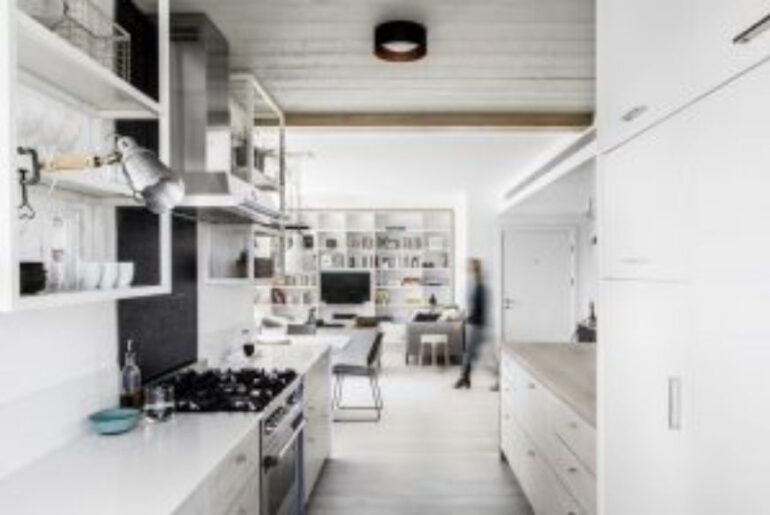 מעצבת הפנים אפרת שמי נדרשה לתכנן מחדש דירה עבור זוג – היא רופאת נשים, והוא חוקר מוח. הדירה ממוקמת בקומה ה-17 באחד המגדלים בתל אביב. "בחלל המקורי הייתה אווירה כבדה וחסרת ייחוד, בשל שימוש רב באלמנטים כהים ועבים כמו פרופילי אלומיניום כהים ושיש שחור", מספרת המעצבת. "היות ורציתי לשוות לדירה מראה בהיר ונקי וכך ליצור תחושה של רוגע ושקט, בחרתי לצבוע את כל משקופי האלומיניום בהתזה במקום בגוון בהיר הזהה לגוון הקירות פרט זה היה רדיקלי למראה הכללי, ויצר רקע ותשתית להמשך העבודה".