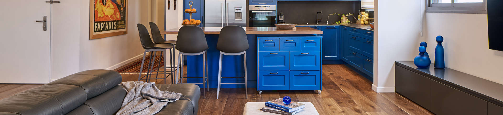 בעלי הדירה בראשון לציון, זוג שעסק במקצועות חופשיים ויצא לפנסיה, ביקשו אזור אירוח מרווח, מזמין וחמים, פינת אוכל גדולה לארח את כל בני המשפחה, כולל הנכדים, נגישות מרבית בחשיבה לטווח הרחוק, חדר עבודה וחלום אחד להגשים לאישה – מטבח בצבע כחול. הדירה בת 5 שנים, 160 מ"ר, נרכשה על ידי הזוג שהגיע מדירת דופלקס באותו אזור מגורים ורצה לעבור לקומת מגורים אחת ללא מדרגות בתוך הבית עם הכנה לעתיד עבור נגישות ונוחות מרבית.