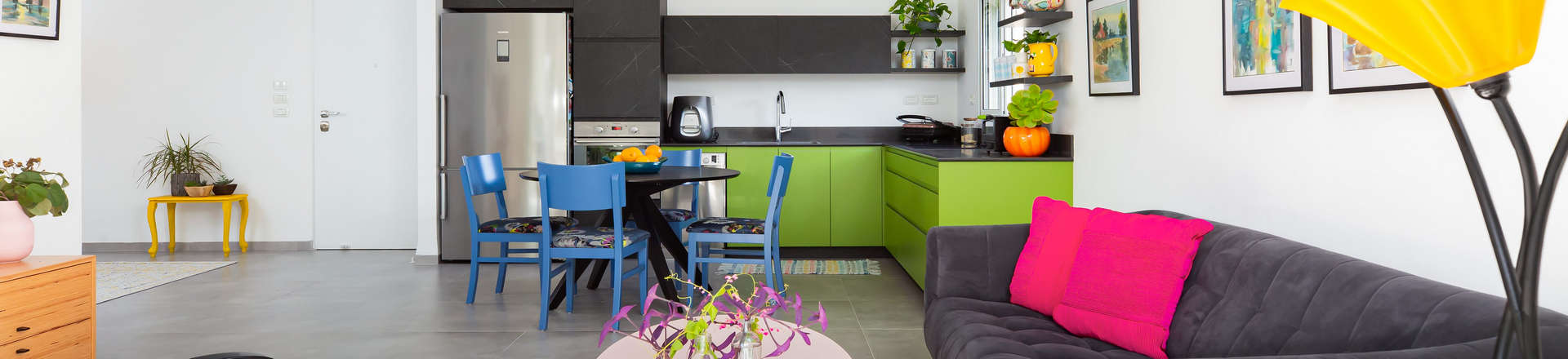 בני הזוג רכשו דירה מקבלן והחליטו לא לשמור על המבנה שלה ועל הריצוף והחיפויים הקיימים. מה שכן, היה להם חשוב להשקיע בריהוט ובאבזור – וכאן נכנסה לתמונה המעצבת דניאלה גלבוע כהן שמתמחה בהלבשת בתים. בתהליך משותף, הצליחו המעצבת והדיירים לדייק את בחירת החומרים והצבעים שיובילו את הלבשת הבית, ולהעניק למרחב כולו אופי אישי. "היה לנו חשוב להמשיך את האווירה המיוחדת שמתקבלת ממראה העצים העתיקים בחורשה הסמוכה", מספרת דניאלה, "ולתת דגש ברחבי הבית על חומרים טבעיים, צבעוניות וצמחייה".