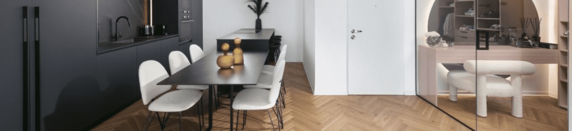 לא להתבלבל, זו דירת מגורים. ההוכחה לכך נמצאת ממול. המטבח, הוא נראה כמו אפור, אבל במציאות הצבע שנבחר עבורו הוא גוון כחול כהה במרקם מט. כל הפונקציות הנדרשות מוסתרות מאחורי דלתות. מהאי, שגם הוא צבוע בגוון כחול, ממשיך שולחן פינת האוכל. לשניהם משטח עליון שחור. השילוב בין האי לשולחן האוכל מאפשר ישיבה לא פורמלית סביב האי, או הסבה לארוחה רשמית וחגיגית בפינת האוכל.