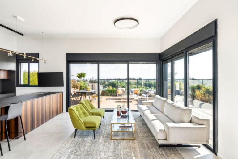 חלוקת החלל החדש בפנטהאוז שתוכנן במקור כדירה בת חמישה חדרים, הותאמה לסגנון החיים של זוג דיירים, אחרי שהילדים עזבו את הבית. המעבר שלהם מבית פרטי לדירה, לווה במקצועיות וברגישות על ידי המעצב והנדסאי האדריכלות ליאור רויטר. בני הזוג מרבים לארח, ובאותה מידה אוהבים לבלות את שעות הפנאי שלהם באווירת פרטית ואינטימית. מרכיב נוסף הבולט בשפת העיצוב האלגנטית, מתבטא בחיבור הרמוני בין האפור, השחור והלבן שנבחרו לעיצוב הפנים לבין הגוונים הירוקים של הצמחייה הטבעית, להם נינתה תשומת לב מרבית בעיצוב המרפסות המקיפות את הדירה.