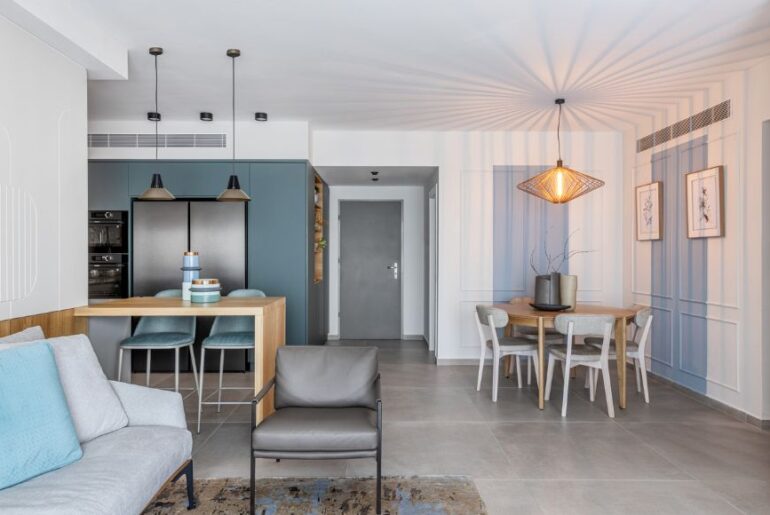 אל מול פינת הישיבה שבמרכזה ספה בהירה, כמעט לבנה, בתוספת כריות תכלת, מוקמו שתי כורסאות בגוון בג' כהה. על קיר הטלוויזיה שנראית כמרחפת, עוצבה כוננית מיוחדת, בעלת רגלי ברונזה ולצידה גוף התאורה יוצא דופן עשוי ברזל וברונזה. בעיצוב קירות פינת האוכל, ניכר שיק אירופאי, בצורת קרניזים מלבניים. בן חיים נתנה העניקה להם טוויסט עכשווי, באמצעות צביעת הקיר בצבע תכלת עדין בצורה מעניינת ומלאת יצירתיות.
