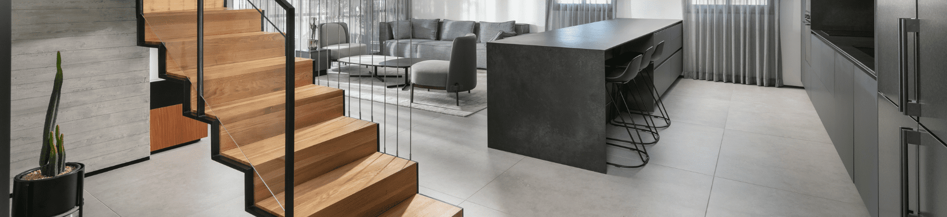 מבט מהסלון לעבר המדרגות למובילות לקומה העליונה שנוספה לדירה תוך כדי השיפוץ