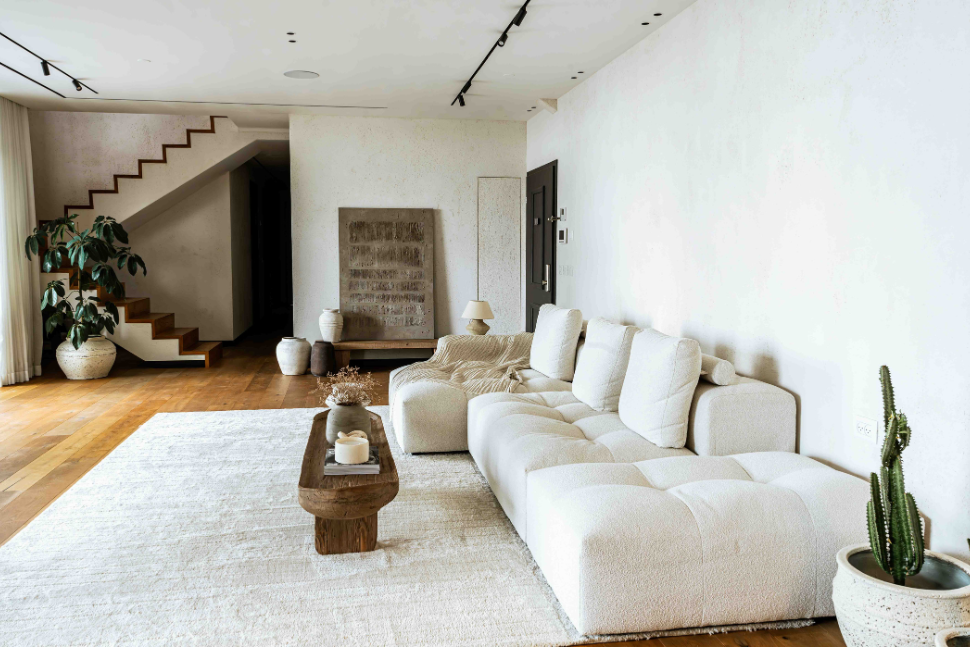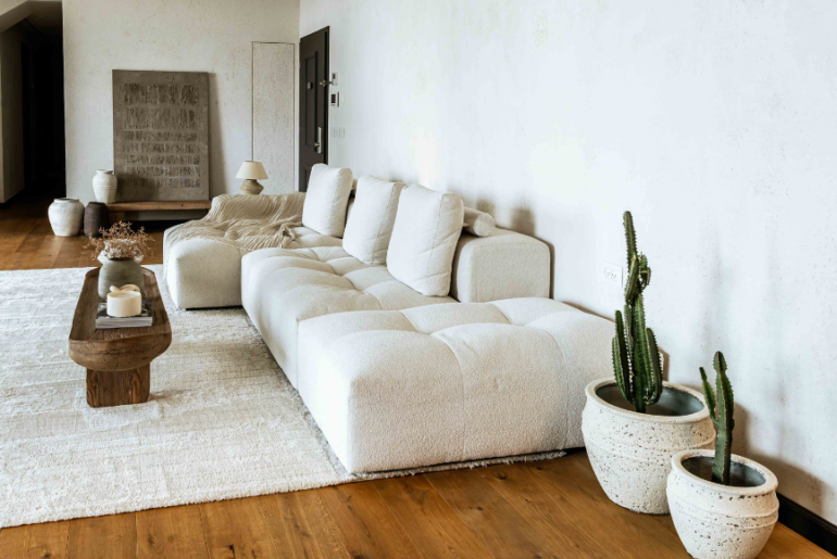 " עם הידיעה הברורה, שאני עומדת לעצב לזוג ההורים ושני ילדיהם, בת ובן, חייל ומתבגרת בית חם ומחבק, החלטנו יחד שהפרט הראשון שיבחר תהיה הספה לסלון. יחד הגענו ל- ART גלריה לריהוט. באולם התצוגה משכה את תשומת לבנו ספה מודולרית שמיד מצאה חן בעיננו דגם קלאוד. הספה הייתה הבסיס לעיצוב כולו. קוויה המעוגלים והרכים הטיפורים המיוחדים והרכות הנעימה התאימו למאפיינים בעיצוב שלי שתמיד חותר ליצירת חמימות, קרבה לאימא אדמה וזיקה חזקה לטבע, ומשם המשכנו הלאה"