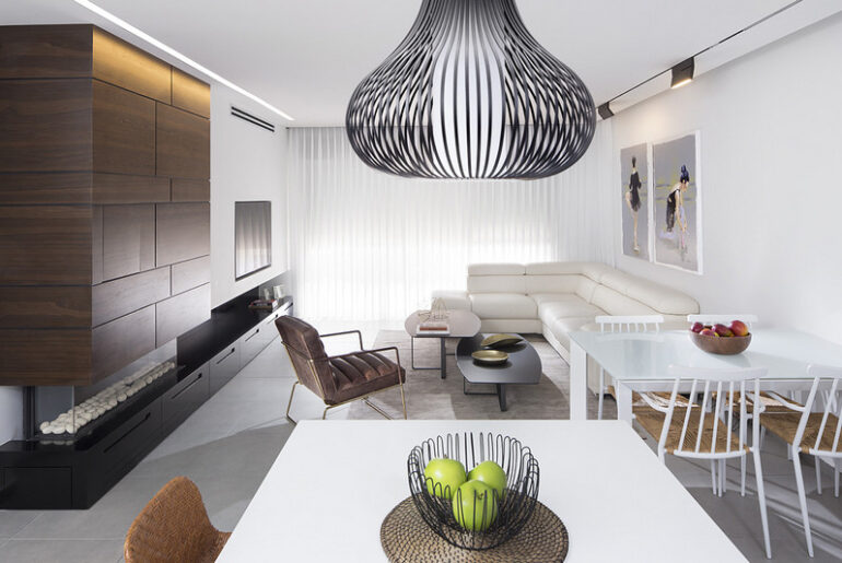 לעתים, בקשות מסוג זה של לקוח יוצרות מגבלות עיצוביות, אולם לא כאלה שלא ניתן להתגבר עליהם, ובגדול. ואכן,המעצב ארז חייט בקונספט ייחודי, תכנן ועיצב בהקפדה את החלל תוך שימוש בקווי עיצוב מינימליסטיים, בטכניקות המייצרות המשכיות מחד והשתלבויות של פרטי נגרות קמין וגז מאידך, הוביל ויצר רצף הרמוני של קווים חוזרים. עיצוב זה העצים ופתח את החלל לממדים מפתיעים. התוצר הסופי: חלל מגורי אורחים חלומי יוקרתי ומרהיב. כך הפכה הדירה כולה לפנינה של ממש, מבלי להותיר זכר ל"עיצוב הקבלני" שנעלם כליל כאילו לא היה.