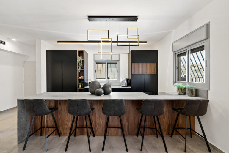 אמנם הדירה ממוקמת בדימונה, מוקפת בחולות ומדבר, אך הלוק העיצובי שהתבקש היה של לופט בגורד שחקים עירוני. לטובת זאת, נבחרה מניפת צבעים כהה בה מככבים שחור וגוונים שונים של אפור, בשילוב נגיעות של ירוק עמוק וחמרה נועזת. את הצבע השחור אפשר למצוא, בין היתר, בארונות המטבח. גם התנור שנבחר הוא בגוון שחור פחם, ומשטח העבודה עשוי אבן קיסר כהה דמוית בטון. "במטבח יש מרקם תעשייתי", אומרת גנון, "יחד עם תאורה מרשימה שתלוי מעל האי".