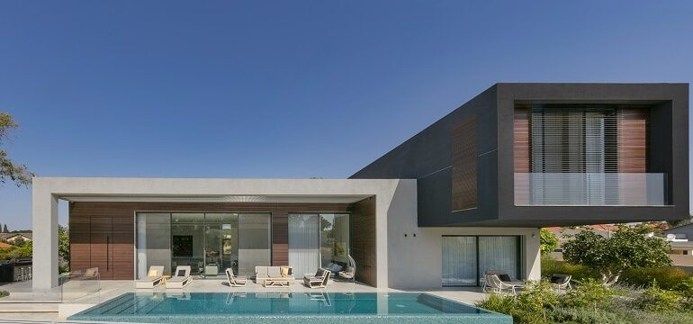 כבר בפגישתם הראשונה עם האדריכלית ביקשו בני הזוג בית דו משפחתי שייראה וירגיש כמו בית אחד, מנותק ומחובר בו זמנית, האחד עבורם והשני עבור ילדיהם הבוגרים. בסיום התהליך זכו בני המשפחה לבית המשרה תחושת שמחה, שלווה ורוגע, תוך אינטגרציה עם חללי הפנים והחוץ. בקשתם של בעלי הבית הביאה עימה אתגר לא פשוט מבחינה ארכיטקטונית, שהתווסף אליו גם מגרש בתצורה מאתגרת אשר אינו כולל אף פאה ישרה אחת, ובכדי להיכנס אליו דרך הרחוב, מצריך מעבר דרך כביש גישה ארוך. כבר בתחילת מלאכת התכנון מספרת האדריכלית כי הרגישה לשמחתה שמדובר במגרש מבורך אנרגטית, כך שבכדי למקסם את סגולותיו ואת השתלבותו בטבע העוטף אותו, צורת ההעמדה שלו על המגרש צריכה להיות יוצאת דופן. כך תוכננה כניסה דרמטית לבית כאשר באזור החזית הכניסה מוקמה בריכת שחייה אינפיניטי מרהיבה, אשר משקיפה אל המרחב הפתוח והנוף שבחוץ.