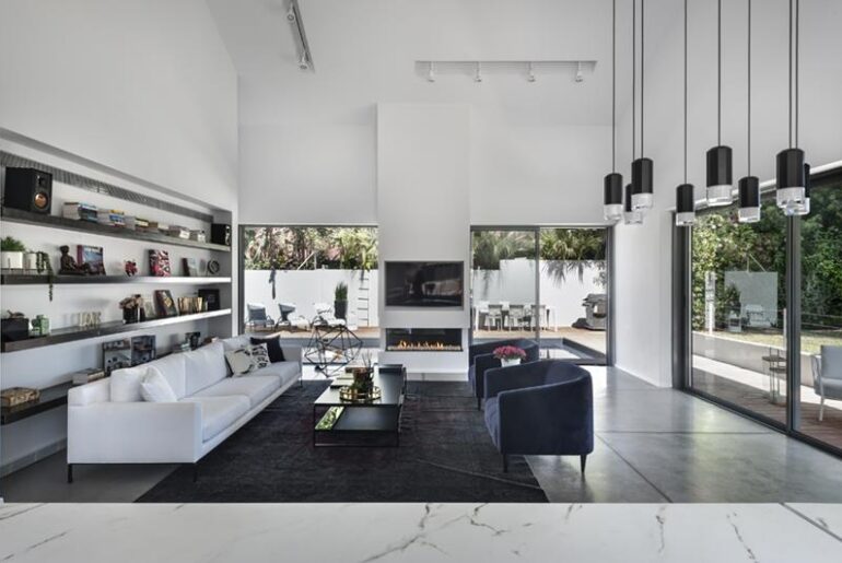 בחדר המגורים תקרה כפולה וקיר בידור מעובה המתנשא לכל גובהו. בקיר משולב קמין גדול ומסך טלוויזיה רחב, ומצדו נישת מדפים אלגנטית לתצוגה. מצדיו של קיר הבידור נשקף נוף מקסים של החצר והבריכה, אלה נשקפים גם מאחורי הקמין, כאשר הוא דולק. חרף גובהו של החלל וסגנונו הנקי והמודרני, חדר המגורים משדר חמימות ונינוחות. זאת הודות לסידור נכון של הרהיטים בחלל, ושיבוץ אביזרים משלימים באופן שאינו מעמיס על החלל, אלא משרה בו תחושת נעימות.