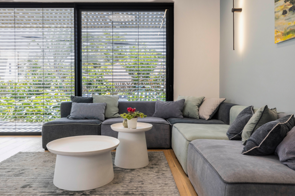 פרויקט עיצובו של הבית החדש, החל בשלב התוכניות וכלל גם את עיצוב המעטפת החיצונית וסביבת הבית. "לשמחתי, לזוג הלקוחות שלי אין בעיה שיציצו להם אל תוך החצר, זה אפשר לי לתכנן להם גדר אלומיניום מיוחדת שנראית כבועות אוויר בים. דרך הפתחים שבוצעו בחיתוך לייזר בדייקנות, אפשר לזהות את שלל חומרי הגמר הטבעיים שנבחרו, כמו שביל של אבני צפחה או גגון סנדות מעל אזור החנייה. את גוון התכלת הדומיננטי בעיצוב הפנים, מגלים גם במעקה הקומה העליונה"