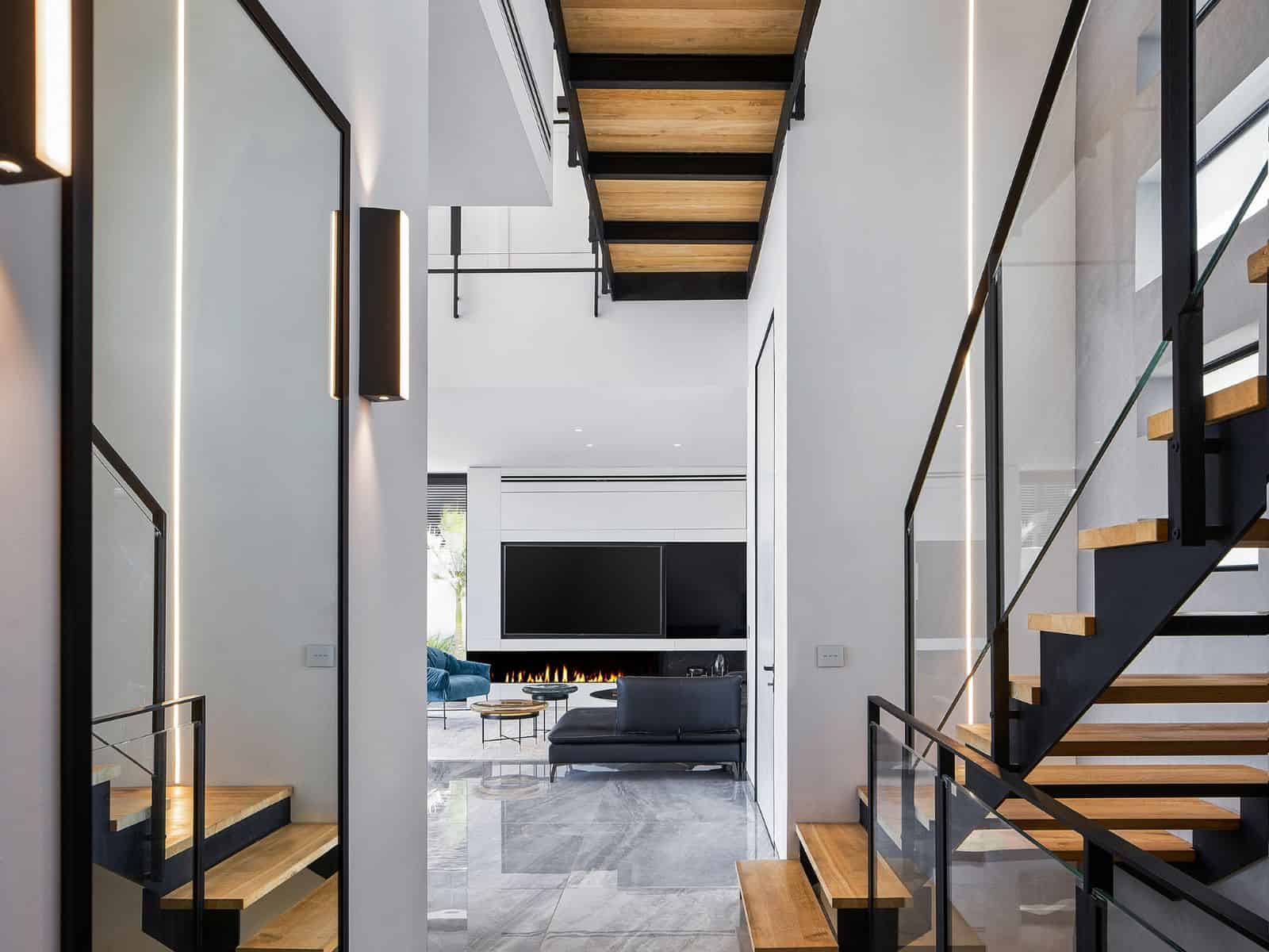 כמו קופסה גדולה המכילה בתוכה קוביות מפורקות שנערמו אחת על השנייה, כך נראה הבית. מרכז הבית, אשר פונה למרחבי הקרקעות שנועדו לחקלאות, נוצר במרווחים שבין הקוביות. קומת הכניסה, שכולה עוצבה כמרחב חברתי, נבנתה כחלל גדול ופתוח ללא עמודי תמיכה.