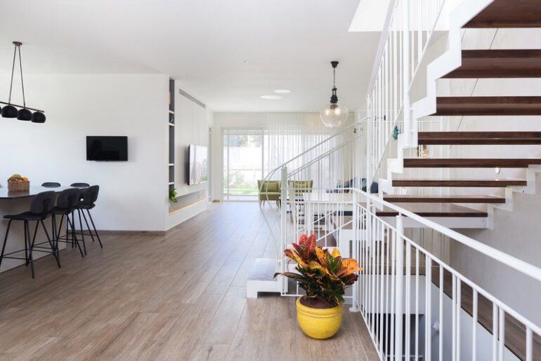 קיר המדרגות עוצב בשילוב של גופי תאורה וטיח ערבה עם חלוקות של פסי ניקל. גג הבית המשופע נראה מתוך הבית עם קורות מולבנים.