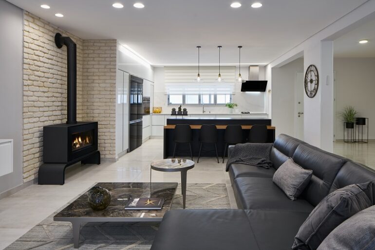בין הסלון למטבח, ניצב קמין גז בו ניתן להבחין מיד לאחר הכניסה ואשר מהווה נקודת עניין מרכזית בחלל. הקמין מהווה אלמנט מרכזי בעיצוב הבית ובעיני המעצבת נחשב כפריט המאגד סביבו את כל הסגנונות והחומרים השונים.