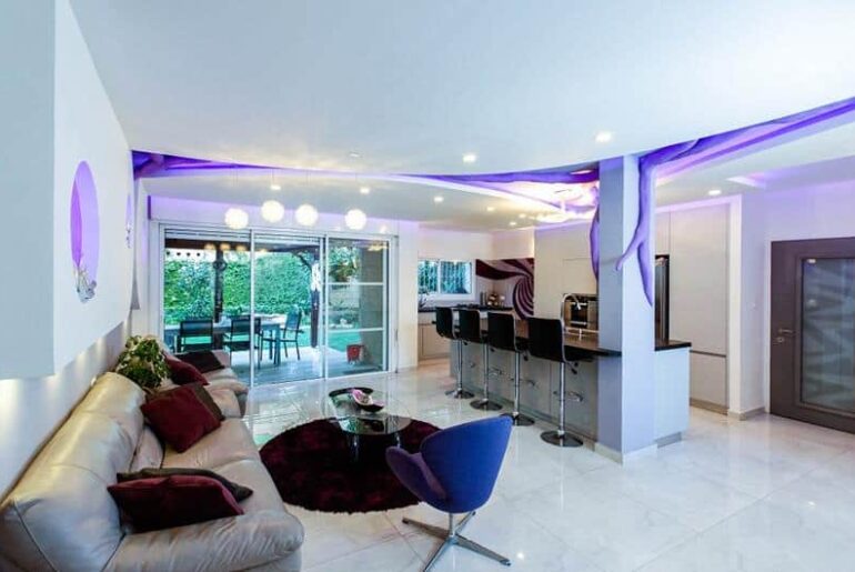 הקונספט הראשי בחלל הוא צמיחה מחדש – חיים חדשים. הוא צומח לתקרה ומלווה את האלמנט התיקרתי לכל אורך החלל המאוחד. אלמנט הגבס הוא עצם בתוך החלל הגדול עם תאורה נסתרת. ההשראה לצורות של הנישות בקירות ובתקרה היא מהבית הקודם, שעוצב גם כן על ידי המעצב. הצורות יוצרות דינמיות ודו שיח בין התקרה, הקירות והעמודים. צורת הספרייה היא שילוב של קשת אובאלית הבאה לידי ביטוי בתקרה ובמדפים האופקיים. האלמנטים העגולים הם אנטיתזה של הנישות הסגולות בסלון.