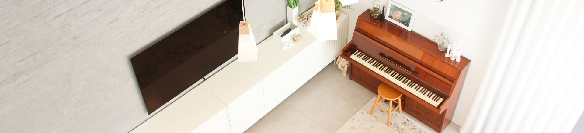 בהתאמה לצורת המגרש, הבית תוכנן בצורת זווית ישרה כאות ר' מתוך כוונה שגם לגינה תהיה צורה דומה, במטרה שחיבור בין הבית לגינה ייצור הרמוניה מושלמת בין החוץ לפנים. רמזים מהעיצוב האקלקטי שכולל, מודרניזם, קלאסיקה, כפריות, אלמנטים תעשייתיים ואפילו וינטג' שמתבטא בפסנתר של פסנתרנית שהייתה קרובת משפחה, מקבל ביטוי גם במעטפת הבית שיש בה ניחוח מסגנון הבאוהואס המחוזק באמצעות תריסי עץ.