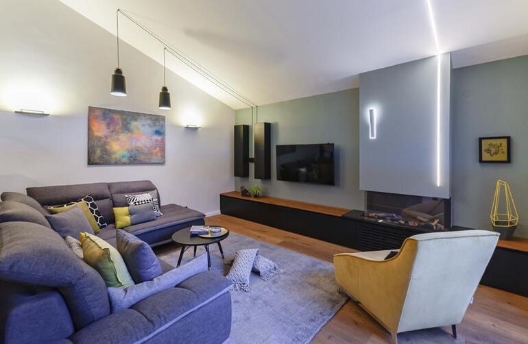 בקיר המרכזי בסלון שולב קמין גז המחמם את החלל ובתוכו גוף תאורה אינטגרלי עם הגבס – פרט שניתנה עליו הדעת בעת התכנון בשל החום הרב שמפיק הקמין. קיר הסלון וקיר המדרגות נצבעו בצבע מיוחד של בנג'מין מור – צבע אפרפר ומעט ירקרק המשתלב נפלא עם שאר צבעי השחור, אפור והחרדל של הבית מסביב לקמין תוכנן מזנון לכל אורך הקיר המסתיר את תשתיות הקמין ונותן אחסון רב.