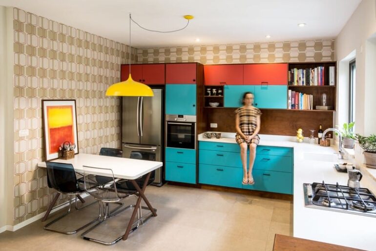 הצבע מופיע בבלוקים וגושי צבע, בעוד שהדפוסים חזקים וברורים בשחור ולבן. כדי לאזן את הצבעים הדרמטיים, נבחר טפט רטרו קלאסי רגוע ונייטרלי בגווניו עבור המטבח וקירות הכניסה (שהפך לעוגן בחדר), שמחבר בין כל האזורים השונים בקומת הקרקע.