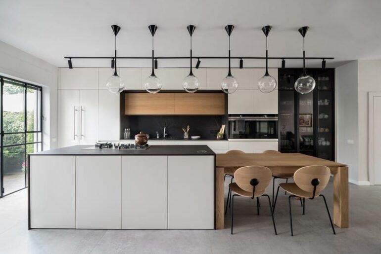 למטבח נבחרו גוונים מונוכרומטיים אשר מדגישים את הקיר הירוק שמחוץ לדלת