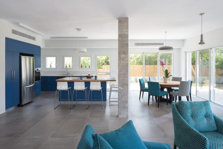 אבל לא הצלחתי. (לא מאמין שאני אומר את זה אבל) חסר פה מגע של מעצב פנים. הבית נראה ערום וקר. פרטי הנגרות ממוקמים בפיזור לא ברור ונראים לא קשורים (למרות הצבע הכחול שמשותף לכווולם!). הוספת שטיח בסלון, וילונות על הפתחים, תמונות על הקירות ועוד חפצי נוי - היתה מביאה את האוירה למקומות אחרים מאד. כחול הוא צבע שאני מכור אליו. אבל כאן החליטו על כחול ותקעו אותו בכל פיסת ריהוט אפשרית. הכחול של המטבח לא תואם ללפחות 3 גווני כחול אחרים במרחב. ובכללי - קיבלתי כחלת. בנוסף - יש פה טעויות ברמת התכנון שגם אדריכל אמור להבין: המטבח מתוכנן נורא! המעבר עם סירים ומחבתות בין הכיריים אל הכיור, מעל הרצפה במעבר, כשכל אחד מהם בצד אחר של המטבח. כיריים על האי שעליו גם אוכלים ?! עם שמן רותח שקופץ על הסועדים, או סתם על המשטח סביבם. מיקרו שתקוע בגובה הקרסוליים??! ברצינות? דלת היציאה מהמטבח מקצרת את גוף המטבח באופן אנוש - כאשר ממש לידה יש ויטרינת יציאה לאותה חצר... שורת חלונות מעל השיש אבל אינם זהים בגודלם. וכולם, כולל הדלת, בגובה אחר מהויטרינה שליד.... בחוץ - בשביל הכניסה יש מדרגה יחידה. זה ממש אסון תכנוני ומכשול שמזמן תאונת נפילה. ולגבי החזיתות - בשביל זה כיסו את האבן הירושלמים? טיח אפור? הבית ממש לא נראה מודרני ככה, אלא לגמרי שנות השמונים.