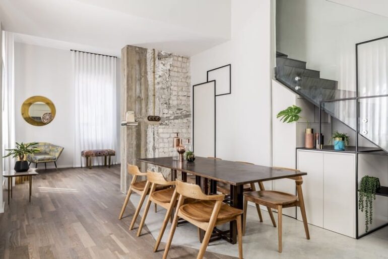 בדירה התגלו אלמנטים מיוחדים כמו קורות הפלדה שנשמרו כדי לשמור על אופיו המיוחד של המבנה