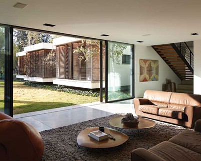 הדבר הראשון שחושבים עליו כשנכנסים לחצר הבית הגדול הזה, ומתקדמים לעבר הכניסה, הוא שהבית מרחף באוויר, היות וחלקים ממנו הוגבהו מעל פני האדמה על ידי קורות ברזל. בבית שרובו משתרע על פני קומה אחת, קיימת זרימה מעגלית המחברת בין הסלון, פינת האוכל, חדר המשפחה והמטבח הגדול. את התנועה ההרמונית משלימות יציאות מתוכננות לגינה שאליה פונים גם שלושת חדרי הילדים.