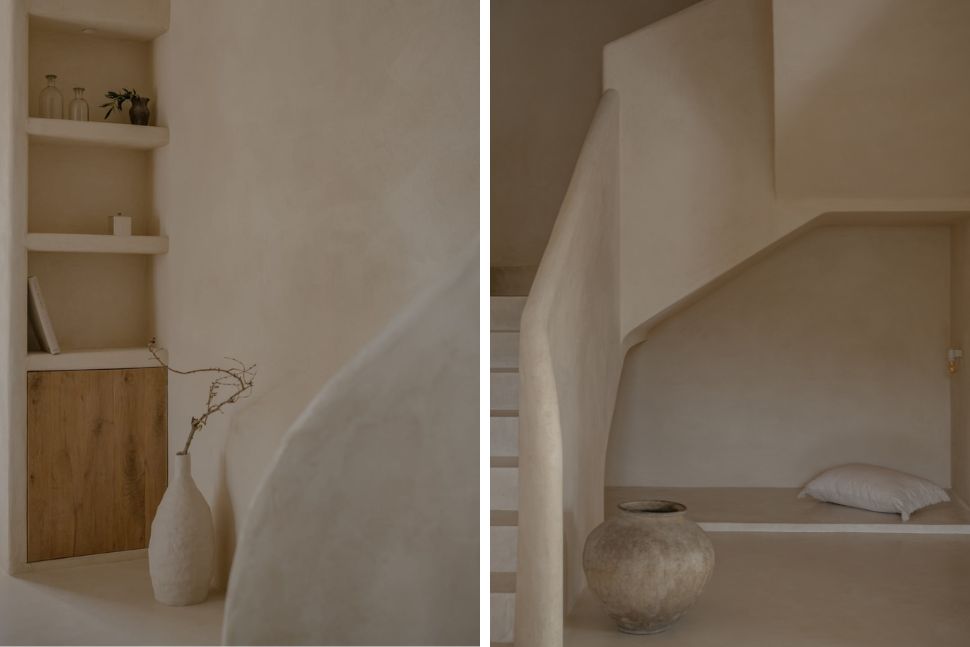ליצירת מראה ואווירה הרמונית בכל הבית, נבחר טיח אדמה טבעי, אשר מעבר להיותו בעל נוכחות גבוהה המעניק תחושה של חום ורכות, הוא  גם בעל יכולת ויסות לחות גבוהה ונטול חומרים רעילים וככל שהזמן חולף, מראהו משתבח. באמצעות מינימליזם שמדגיש נוחות ובו בזמן הרבה חום, תוכנן המטבח כמקום מרגיע . לפיכך, מעל המשטח הפרקטי שעשוי פורצלן, הותאמו לגוון הטבעי של הטיח אריחי קרמיקה מרוקאיים – זליג' המיוצרים בעבודת יד.