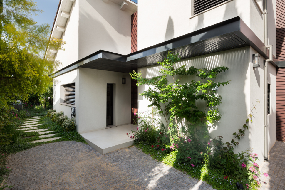 התכנון והעיצוב מחדש של הבית מתבטא גם במעטפת. את החזית הלבנה חוצה פס רחב עשוי ברזל צבוע אפור כהה שבחלקו מתרחב לגגון קטן בכניסה לבית ומתחת לחלון. נגיעות של עץ שולבו בכניסה לבית ובחיפוי קירות הגומחות שנוצרו במעטפת. הירוק של הצמחייה משתלב במראה הכללי בדיוק כפי שגווני הרהיטים הצבעוניים משתלבים בעיצוב הפנים.