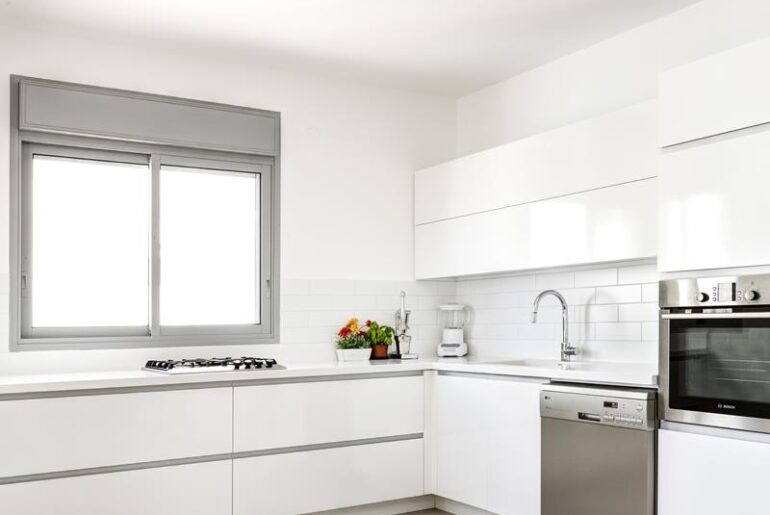 בכדי לשמור על חלל פתוח, בוטל קיר מפריד בין המטבח לפינת האוכל. כך התקבל חלל אחד המכיל מטבח, פינת אוכל מרווחת וכן חדר מגורים ומבואת כניסה קטנה. המטבח הותאם לדרישות נוחות הבישול: התנור והמיקרו קיבלו מיקום על פי גובה הדיירים, והורחב שטח משטח העבודה. מכיוון שבני המשפחה מרבים לארח, וכדי לאפשר אירוח של 12-15 אנשים סביב השולחן, הוחלט שלא להוסיף אי עבודה ולאפשר פתיחת שולחן האוכל לאורך כל פינת האוכל, תוך גלישה לשטח המטבח. שולחן האוכל משמש בימים רגילים עד 6 סועדים, ובסופי שבוע או באירועים מיוחדים ניתן לפתוח אותו ולארח סביבו, ברווחה. בהתאם לקונספט הנקי של הדירה, ממשיך השיש הלבן לעלות כחיפוי קיר ומשתלב עם חיפוי אריחי רטרו לבנים.