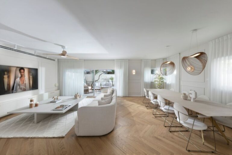 להפוך בית ישן, שנבנה בשנות השמונים, לבית החלומות של משפחה צעירה, זה סיפור לא פשוט. אחרי שהוחלפו כל מערכות התפעול בבית, המעצבים מירב ואייל שלום החליטו להחליף בין מיקום הסלון והמטבח, על מנת לקרב את הסלון אל החצר האחורית. גרם המדגרות שממוקם מול הכניסה וחוצץ בין השניים נשאר במקומו. דרך הוויטרינה שהורחבה, נראית המשכה של סצנת בילוי לשעות הפנאי והאירוח.