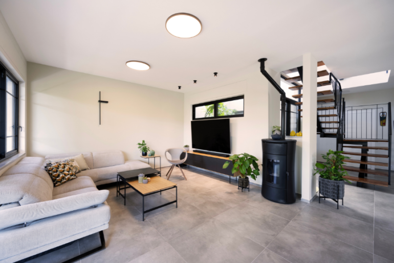 " העמדת המבנה והתכנון הפנימי גם משפיעים אחד על השני. קומת הקרקע נועדה למבוגרים, סלון מטבח, חדר שירות שמחובר עם פיר לקומת הילדים, ממ"ד ויחידת המגורים של ההורים. לבקשת הלקוחות שלי, חלל המגורים הסלון והמטבח לא כוללים פינת אוכל, עליה הם החליטו לוותר. זרמתי אתם, ובמקום פינת אוכל עיצבתי במטבח אי גדול שמשמש אותם לארוחות ופגישות משפחתיות".