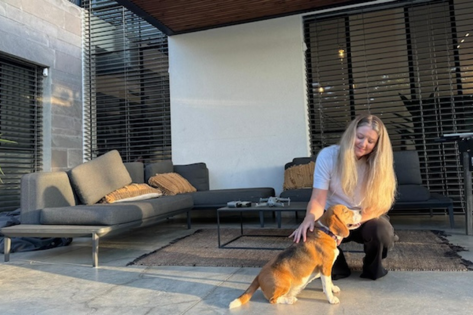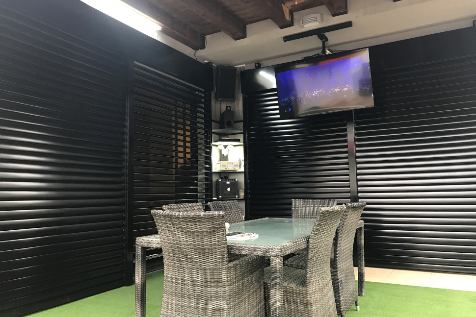 פינת ישיבה בחצר ברקע צילונים נאספים במראה אחיד וחלק