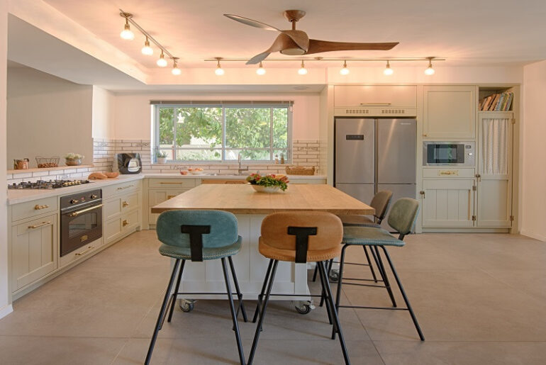 מטבח קלאסי בגוונים בהירים שמשתלב באופן מושלם עם הניגודיות של אריחי הרצפה הצבעוניים