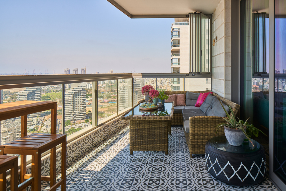 מרפסת פונה אל נוף אורבני ובקצהו הים
