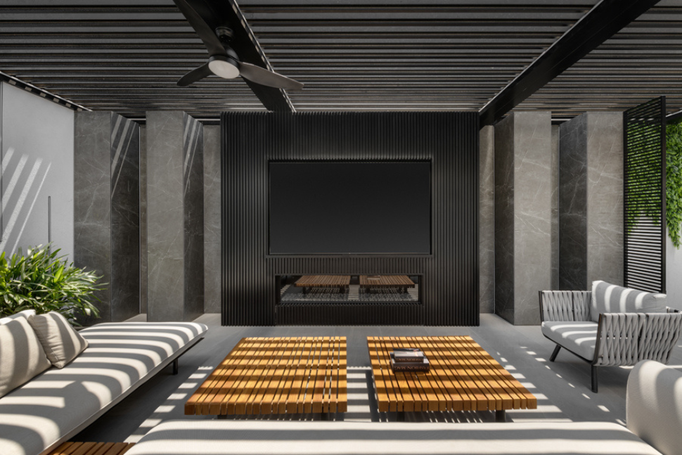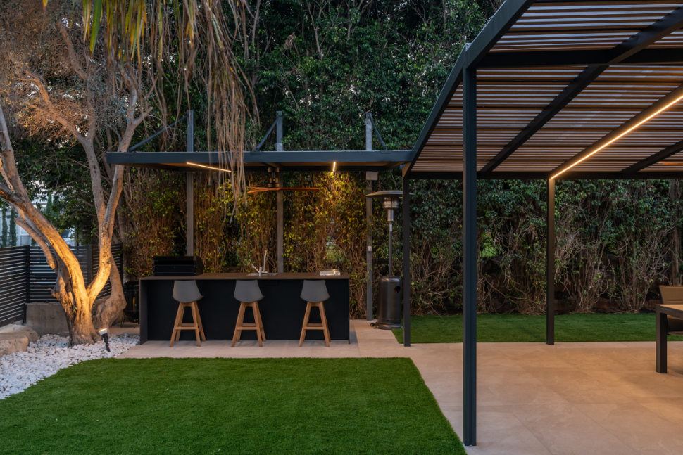 מתחת לפרגולה שאפשר לאטום אותה בימים גשומים, עוצבה פינת ישיבה סלונית כולל טלוויזיה ומערכת סאונד מוגנת. אז תגידו לי… מי ירצה להיכנס הביתה כשאפשר לשבת בחוץ ולהרגיש בפנים וככה ליהנות מכל היתרונות.