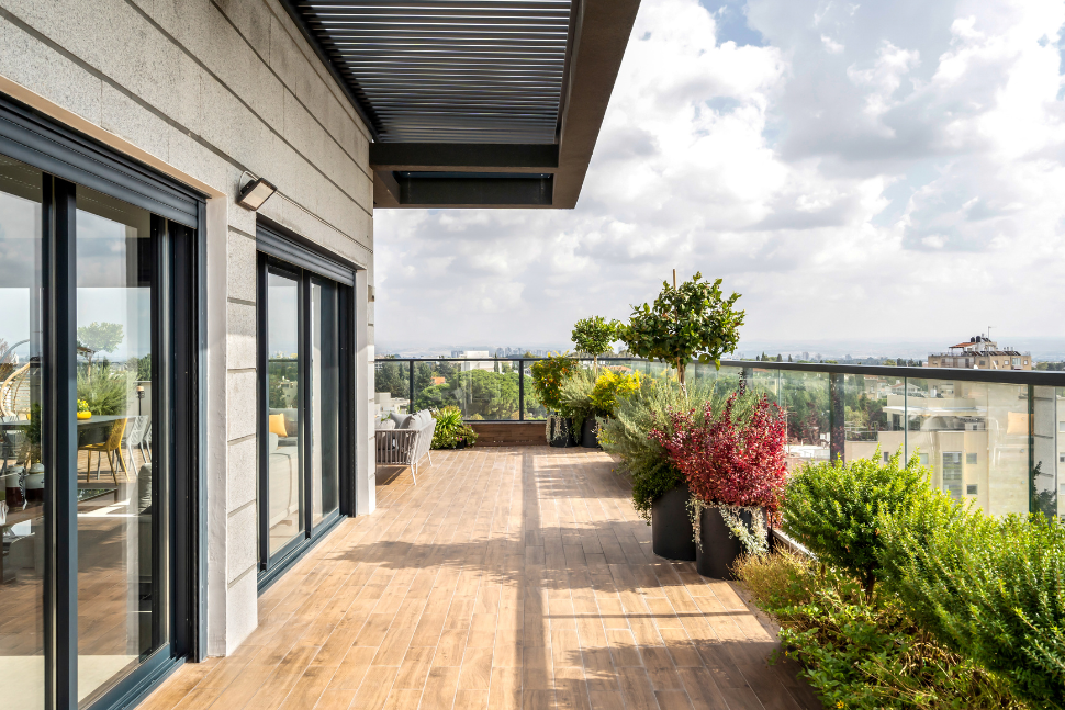 מרפסת עם צמחייה בתוך עציצים גדולים