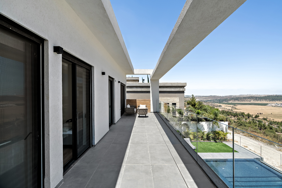 מרפסת מאורכת עם מעקה שקוף פונה לכיוון הנוף