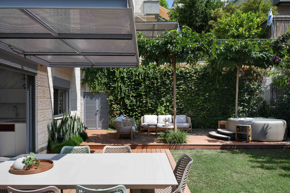 חצר עם שלוש פינות: אוכל , סלון ג'קוזי וגם דשא וצמחייה