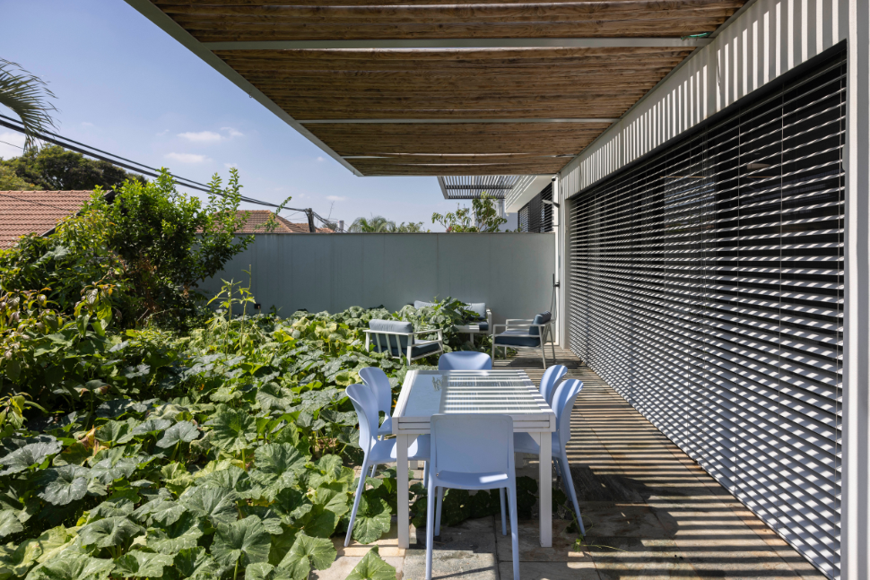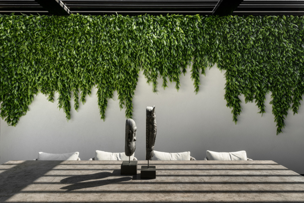 קיר שתוחם פינת אוכל חיצונית, כוסה בצמחייה הגולשת עליו מעציצים