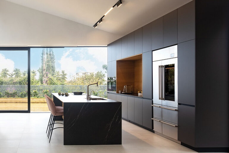 במטבח זה ויטרינה גדולה במסגרת את יחידת הארונות התחתונים ומגיעה ממש עד משטח העבודה בעזרת פרופיל שקוע שהוטמע כחלק ממשטח הדקטון הבהיר. אותו משטח ממשיך החוצה לכיוון הבריכה כמדף וכחיפוי קיר, היוצר חיבור פיזי בין הפנים לחוץ ומעצים את הקשר ביניהם. החזיתות של הארונות הגבוהים והנמוכים משתלבות בהרמוניה בחלל בזכות הגוון הלבן והאי המרכזי הובלט באמצעות צבע שחור, סביבו רצפת פרקט שמעשירה את החלל באווירה חמה וביתית.