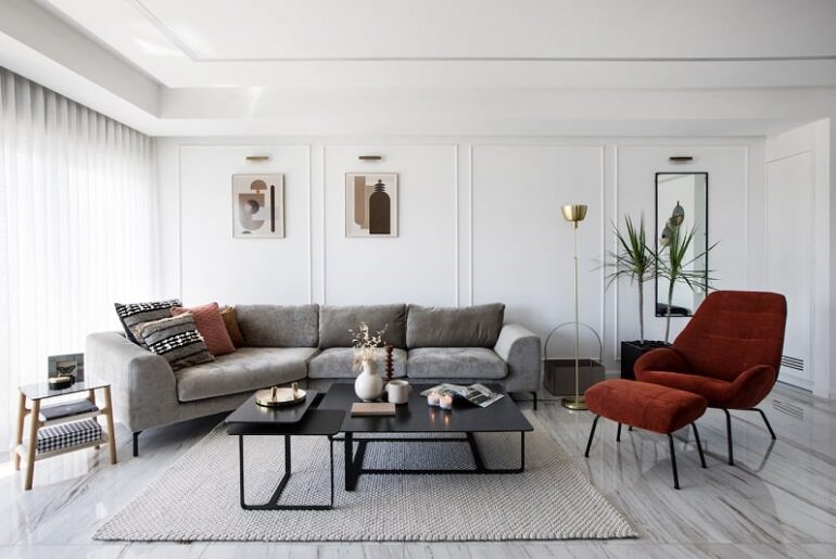 קירות עם קרניזיםשימוש בפרופילים המקפיץ את מראה הסלון כולו. עיצוב פנים: לירז בוקעי. צילום: שירן כרמל